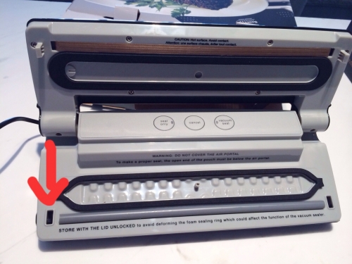 打開抽真空機,在中間有一個小氣孔,抽真空時膠袋邊一定要放在低於小氣孔的位置,才能抽。