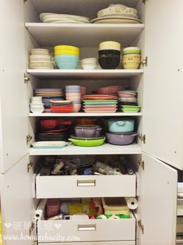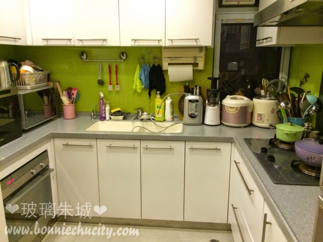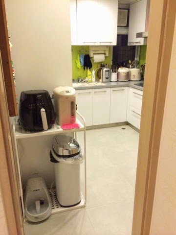 整間屋的最不滿可算是廚房吧!業主不太講究烹飪,所以都是普普通通的!連焗爐也沒有,我要自己加。初搬入時更因太多電器不夠放,當在入門位加了個架後,便鬆動了一點!