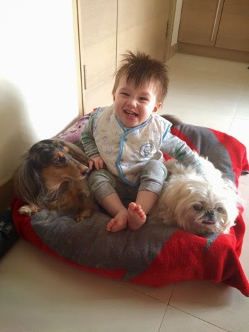仍然跟他的狗狗十分老友,最愛走到他們的狗床一起在~