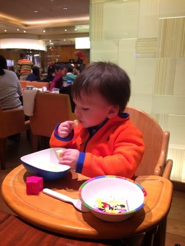 他亦第一次自己進食,小朋友初學時會弄得一團糟,但千萬別制止他,寧願之後清潔。因這是學習的重要一貨,否則長大也要你餵才吃。