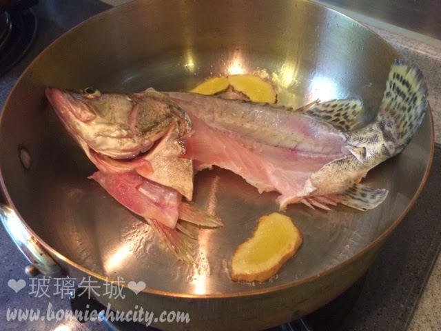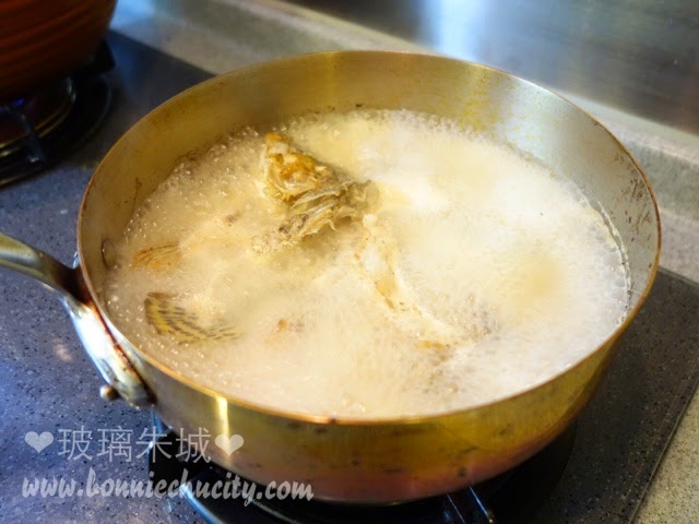 6)做魚湯底:下油下兩片薑,把魚骨煎香。
