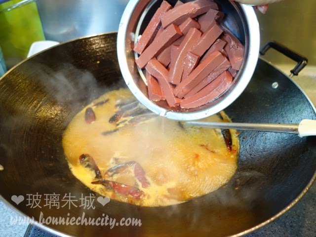 12)把浸豬紅的水倒去,加入煮滾了的湯中。繼續煮大約5分鐘至豬紅熟及入味。