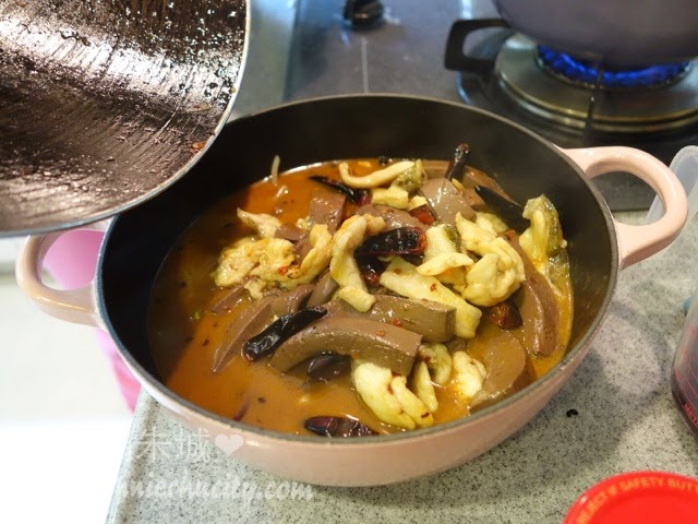 15)豬紅入味後加入魚片略煮1分鐘至剛熟便熄火。