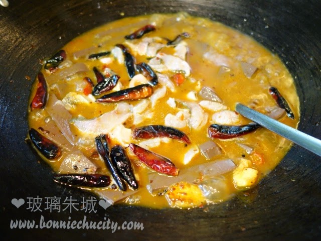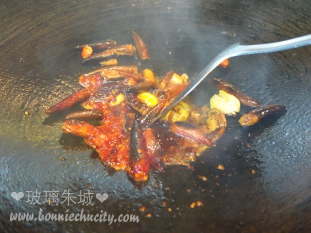 10)下油,中大火先炒香蒜頭、指天椒及乾辣椒。再加入桂林辣椒醬及豆瓣醬炒香。