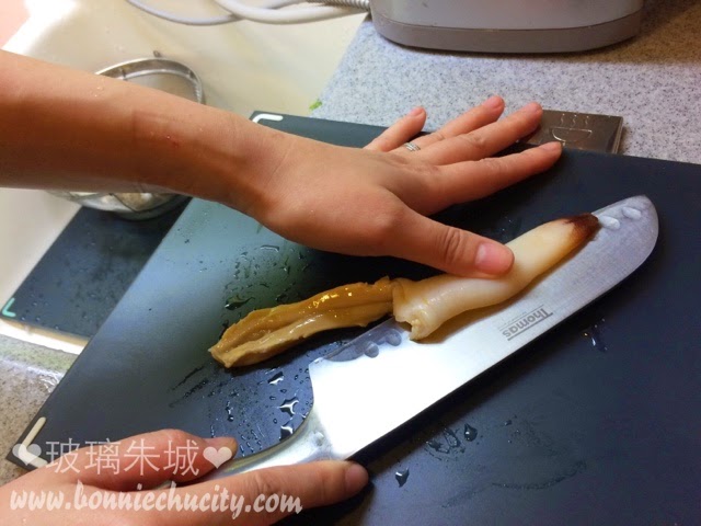 1)象拔蚌先去殻,再浸入熱滾水幾秒,便可撕去衣(海鮮檔可代勞),用食水再沖洗一下,找熟食切板,放橫平切開。