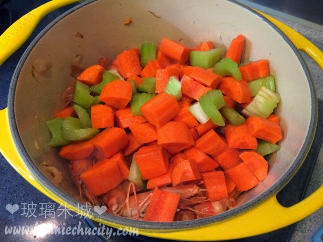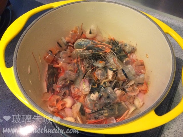 4)中火下油,炒香蒜及乾蔥。再放入蝦殻蝦頭、蚌膽炒至金黃香味散出。