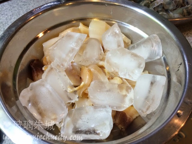 3)切好的象拔蚌片,放入少許冰塊,放入雪櫃待用。