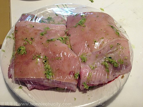 10)切好的豬肉,放至空溫。或你可以放入焗爐用150度焗一會至暖。