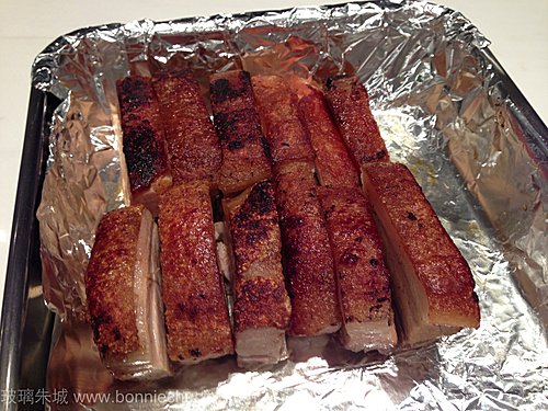 14)下油在煎PAN,油熱之後中小火豬皮向下放入幾塊五花腩一起煎,把豬皮煎香(只煎皮不用煎肉)。放入時要馬上蓋上蓋,因為油會彈得十分厲害。起碼一分多鐘後才慢慢開蓋查看,約煎1,2分鐘至皮金黃香脆便可。