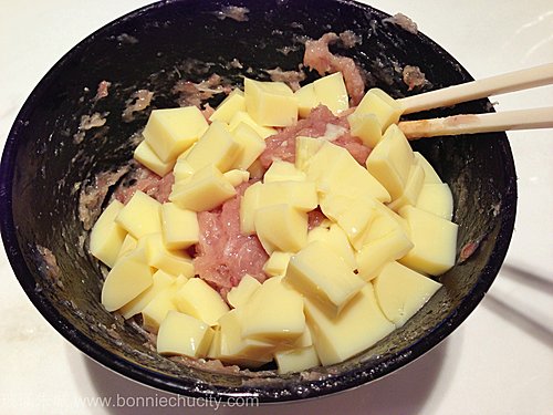5)蒸之前加入2/3已切粒的玉子豆腐,順一個方向攪勻。