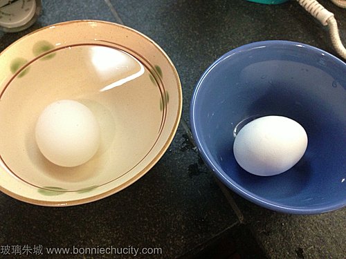 1)室溫蛋凍水一起落開火,其間不斷用筷子滾動雞蛋,這會令蛋黃罝於中間。於水中加入1小匙baking soda 去煮,會令之後更易去殼。