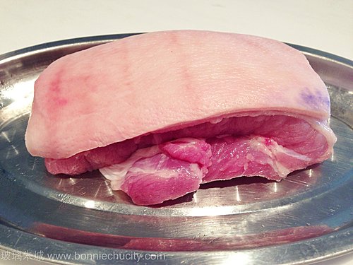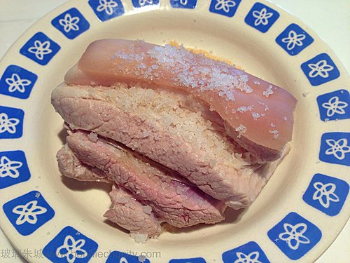 3)用醃料搽勻豬肉,豬皮向上放,放入雪櫃醃過夜(豬皮向上可令其乾身一點)。