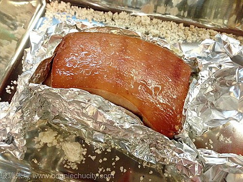 9)調高焗爐用面火220度,再焗15-20分鐘至豬皮香脆(豬肉位置盡量靠近上火)。