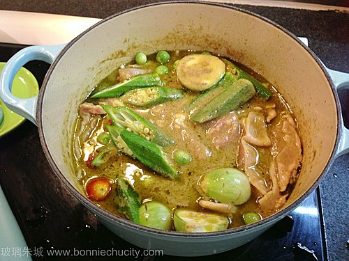 2)調至小火,加入椰奶,煮滾至均勻.加入雞肉,車厘蕃茄,大小矮瓜,秋葵.