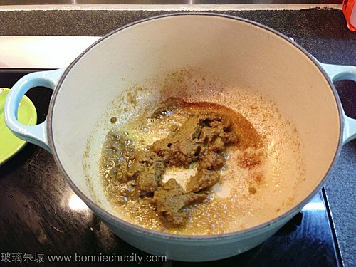 1)下油煮熱,放入咖哩醬,小茴粉,芫茜籽,中火炒1,2分鍾至香.再加入魚露及糖.