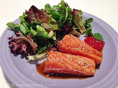 5)醃過的三文魚可上碟,之後再配以沙律,可以用有多的汁醬或日式豉油和風沙律醬最好。