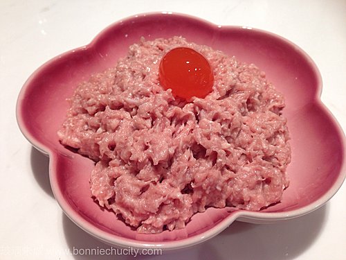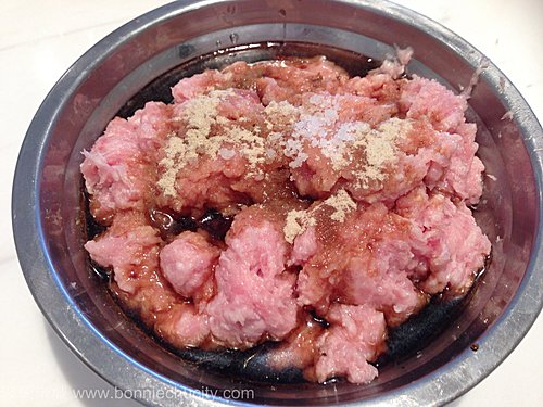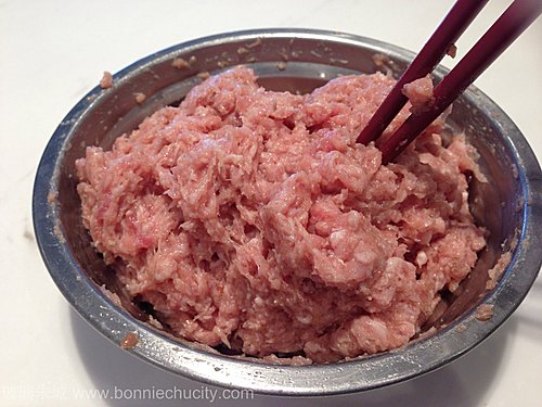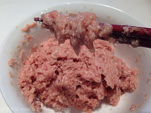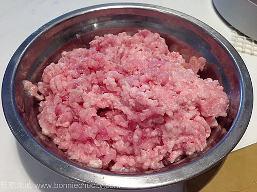 3)把兩種豬肉加在一起。(半攪半剁的肉醬會又夠黏,又有口感)