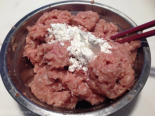 7)加入蛋白(若有),再逐少逐少加入水,循一個方向攪至黏身滑嫩。攪豬肉要輕輕的翻動手勢,切勿大力打撻及擠壓。