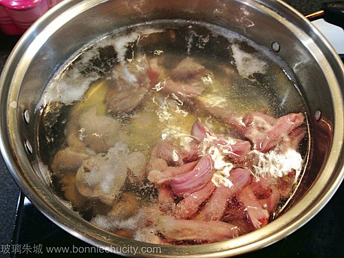 1)鴨舌/雞腎洗淨,放入水用中火煮熟.鴨舌煮5分鐘,雞腎約8分鐘.