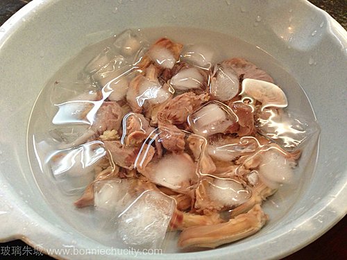 2)煮熟的鴨舌/雞腎用水沖一下,再浸冰水約15分鐘.