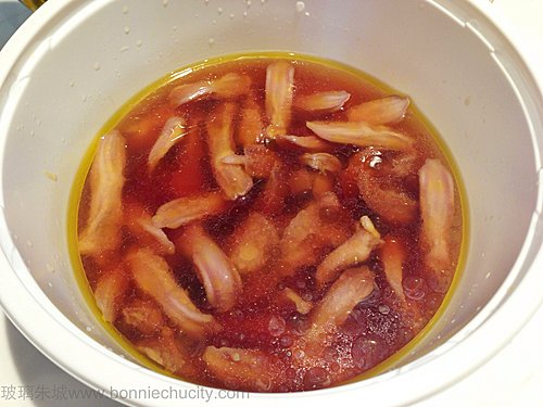 3)浸完冰水的材料,加入所有醃料,放入雪櫃醃浸過夜便可以食用.十分簡單.(各醃料份量亦可因應個人口味加多減少)