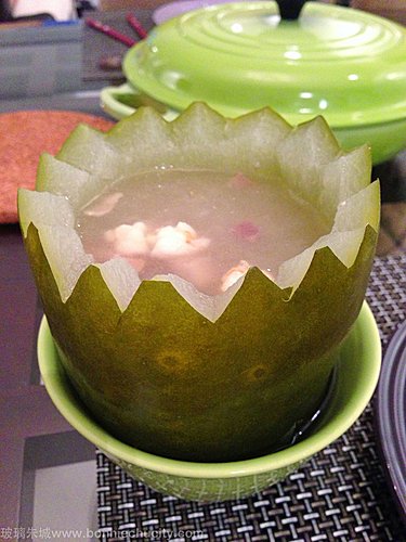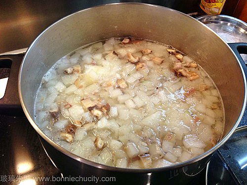 4)蒸瓜同時把所有切好粒的豬肉,冬菇,瑤柱,冬瓜粒,火腿放入煲,加水用中小火煲15分鐘,最後2分鐘才加入蝦肉。再落鹽調味,湯可以偏鹹一點,因之後蒸冬瓜盅時會出水溝淡。