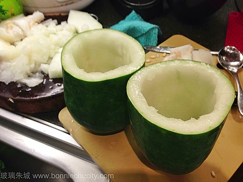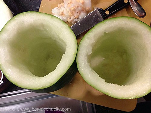 1)迷你冬瓜洗淨,一開二。用匙把瓜芯起出,再用刀把瓜肉切出。瓜肉切粒備用。