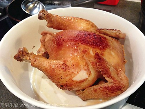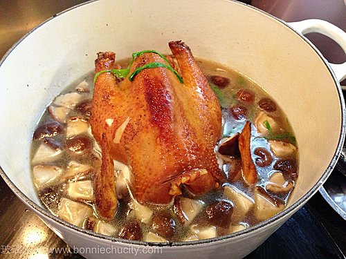 5)之後加入雞,及汁料的紹酒,雞湯及水.汁料要一半蓋過雞.水滾後蓋蓋轉文火(最細火),左脾雞胸那面煮6分鐘, 再反右脾胸那面煮6分鐘.最後反雞背那面煮5分鐘.