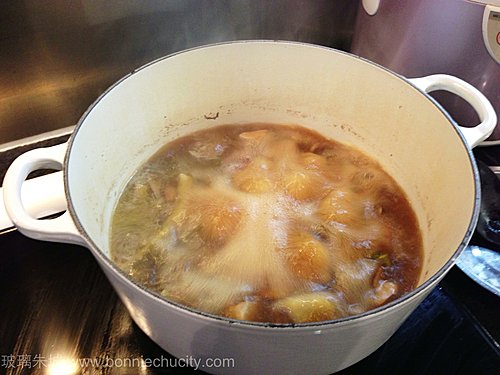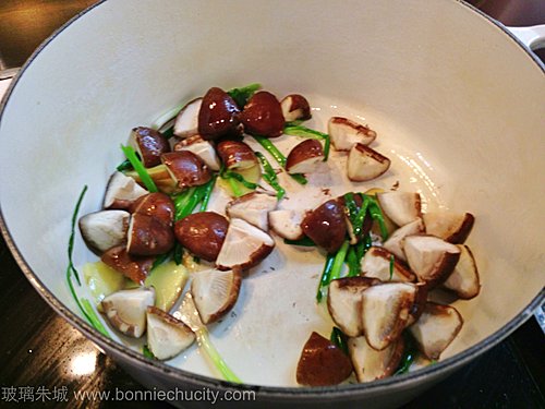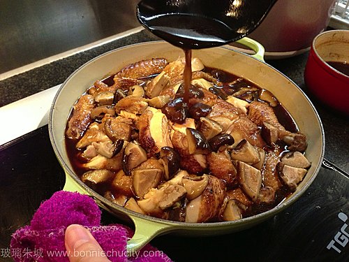 11)加入調好味的汁料,略浸少少雞便可不用下太多.再加入之前煮過的冬菇放面.