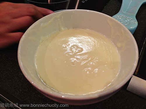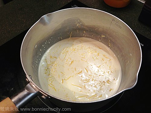 1)芝士加入忌廉,用最慢火煮20分鍾,其間不時攪勻以防黐底.