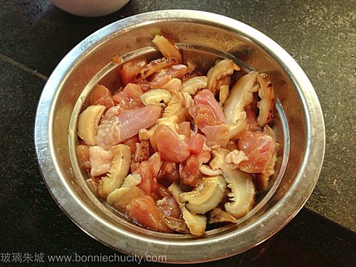 1)調味料放入洗淨的雞粒及冬菇絲,醃最少15分鍾以上.