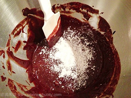 3)加入融化了的牛油朱古力攪勻,再篩入麵粉攪勻.