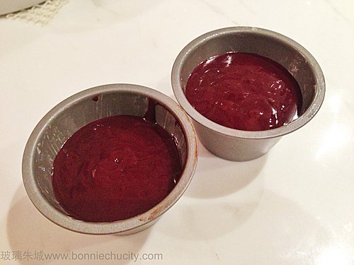 1)先將朱古力及牛油隔水融化,焗爐預熱210度.