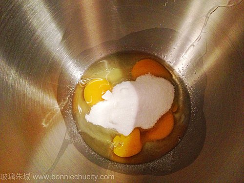 2)雞蛋加入幼砂糖用打蛋器攪勻,攪1,2分鍾便可,不用打至起泡.