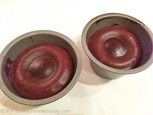 4)倒入已搽了牛油的布甸模內,再放入焗爐用210度火焗8分鍾(塗牛油後灑些麵粉或朱古力粉會更易倒模).