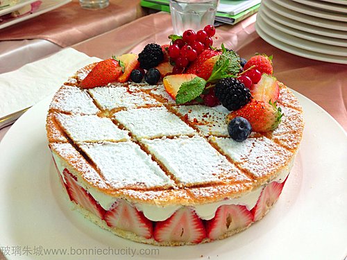 灑些糖霜在面,燒些花紋,再鋪些水果,即成.好快手呀!勁!