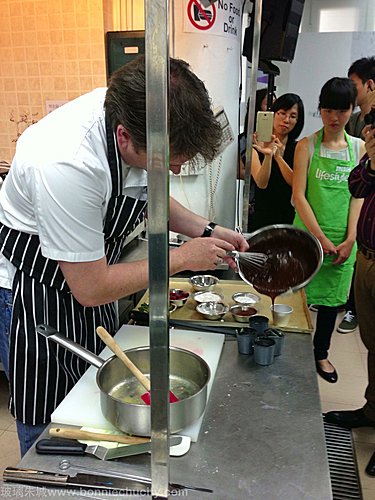 最後,本來要一齊做的【朱古力心太軟】,也因時間關係變成他個人示範.他說這個食譜要在該餐廳工作了3年才到手,現在60秒便給了我們,幸運.