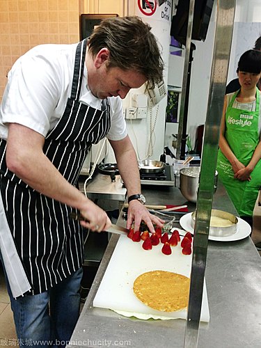 首先,他個人即場示範弄一個用少於十分鍾便可完成的「士多啤梨蛋糕」!他用現成的蛋糕做餅底餅面...