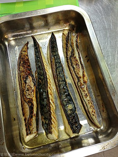 鯖魚就只需搽少少油,皮向上用火槍燒熟便可,幾分鍾便成,好方便啦.用火槍燒還可以煮帶子,三文魚等等...