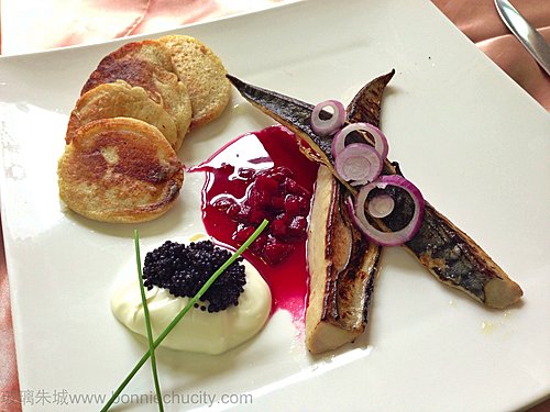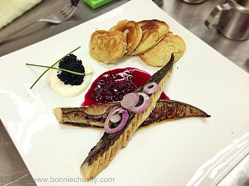 之後,他便教大家一起煮他餐廳的名菜【燒鯖魚紅菜頭配魚子醬小班戟 Blow-torched mackerel with blini, warm pickled beetroot and chive crème fraîche】作為大家各自的午餐,自己煮得爛便沒有得吃啦