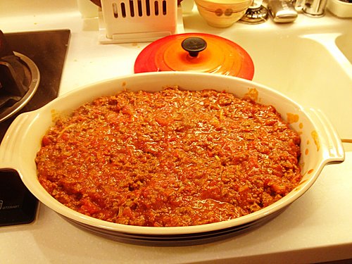 1)免治肉先醃好一會。下油,炒香洋蔥,再加入牛肉炒勻。(此時預熱焗爐至190度)