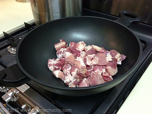 1)熱鑊,不用下油(他說要健康點),用中大火煎香排骨.