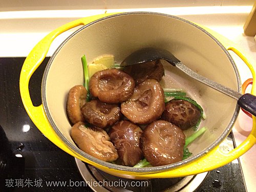 3) 冬菇浸水6小時,之後拿出,冬菇水留起.東菇去椗,洗淨.放回冬菇水內,加入冰糖,紹興酒,雞汁(或雞粉),放入燉盅燉1.5小時.(或你可隔水蒸70分鍾)備用.
