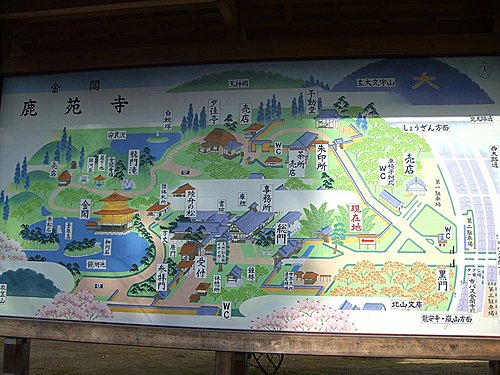 金閣寺分為三層樓閣位於鏡湖池畔,底層為「阿彌陀佛堂法水院」 ,中層為「潮音閣」的觀音殿,上層為名「究竟頂」金色鳳凰矗立其上,醒目而尊貴。