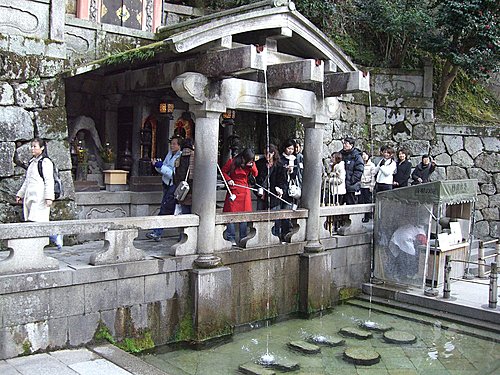 清水寺因寺中清水而得名,順著奧院的石階而下便是音羽瀑布,清泉一分為三,分別代表長壽、健康、智慧,被視為具有神奇力量,遊客路經此地一定會來喝上一口水,據說可預防疾病及災厄。