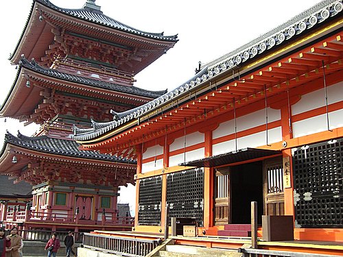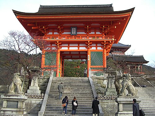 參觀過銀閣寺後, 再到著名的清水寺. 清水寺為公元798年所建造,為平安時代之代表建築物,後來曾多次遭大火所焚毀,現今所見為1633年德川家光依原來建築手法重建,與金閣寺、二條城並列為京都三大名勝,也是著名的賞楓及賞櫻之著名景點。