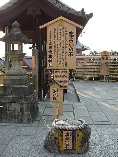 地主神社裡有一對相距10米遠的「戀愛占卜石」,相傳如能閉著眼睛從這邊的石頭走到對面的石頭前,兩個人的戀愛便會如願以償。如走偏了,很可能要出現一些波折。