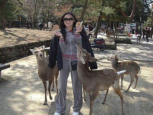 由大阪駕一個小時車, 便到了「奈良」了. 首先來到位於東大寺外的奈良公園, 公園最出名便是有二, 三百隻梅花鹿. 牠們有大有細, 十分可愛友善. 急不及待便買些餅乾去餵牠們.