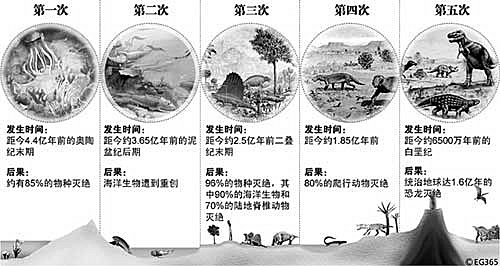 自從5.4億年前地球進入顯生宙以來,在生命進化過程中共發生過15次生物滅絕事件,其中有5次生物大滅絕,這樣的大滅絕延續的時間比較長,可能是幾十萬年或 幾百萬年。 至於第六次會延續多久,目前很難預測。