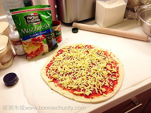 4)塗上茄糕,再塗少許橄欖油.之後下些調味料如西班牙辣椒粉,意大利香草,胡椒.再鋪上Mozzarella芝士.